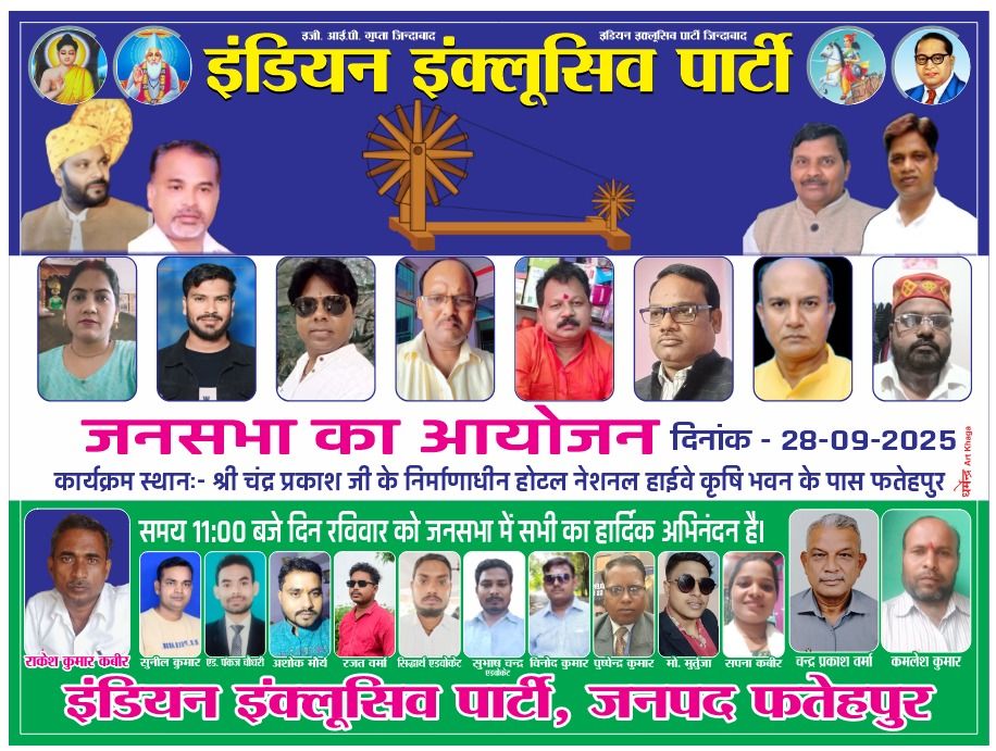 उत्तर प्रदेश की राजनीति में अपनी पकड़ मजबूत करने के इरादे से इंडियन इंक्लूसिव पार्टी iiP आगामी रविवार 28 सितंबर 2025 को उत्तर प्रदेश के फतेहपुर में एक बड़ी जनसभा आयोजित कर रही है यह कार्यक्रम श्री चंद्र चंद्र प्रकाश जी के निर्माणाधीन होटल नेशनल हाईवे कृषि भवन के पास फतेहपुर में सुबह 11:00 होगा।